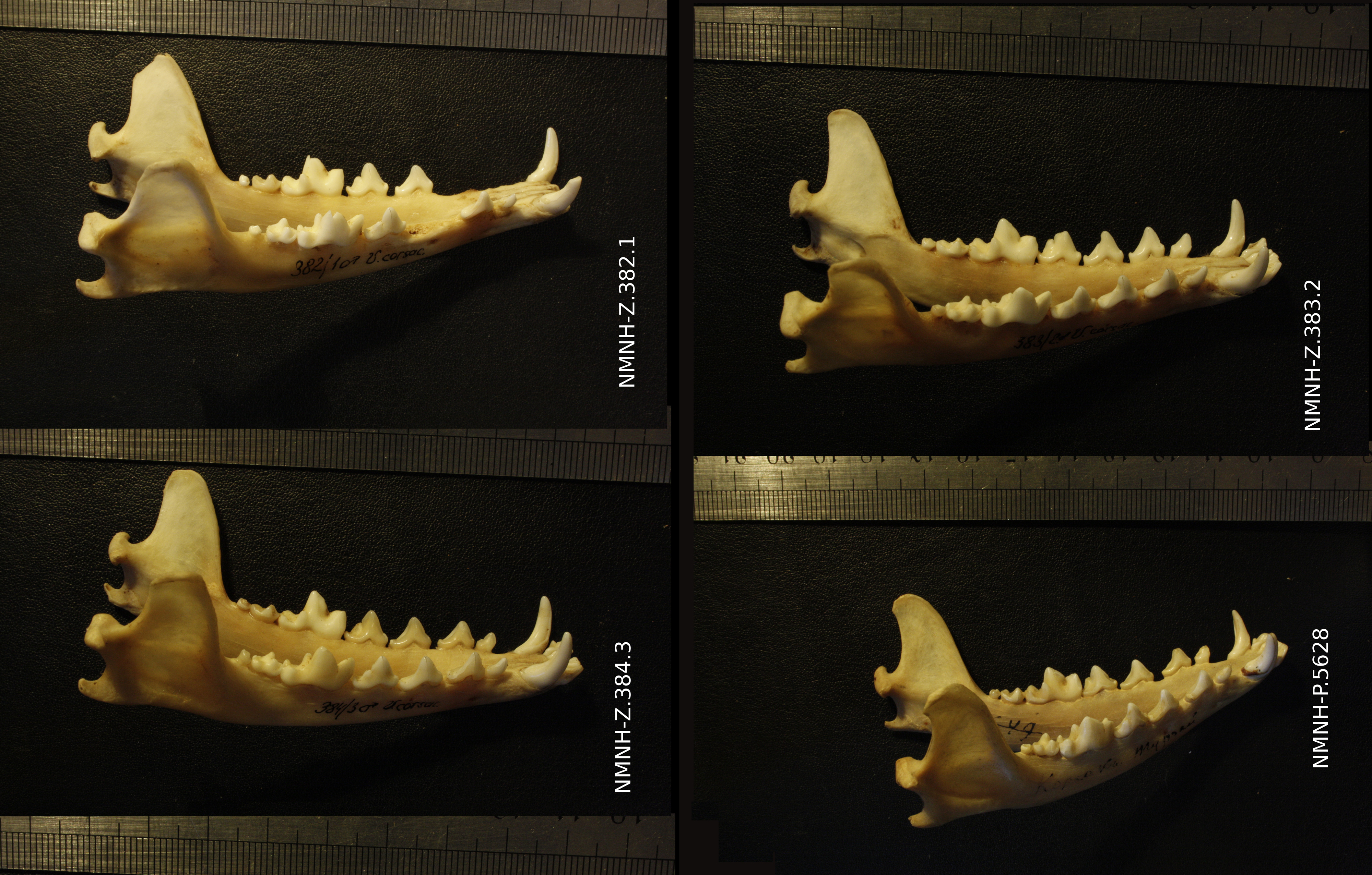 Vulpes corsac turkmenica / spp. - 3 mâles / 1 indéterminé - Collection : Musée de Zoologie / Musée de Paléontologie, Muséum National d'Histoire Naturelle, Kiev, Ukraine (Id:384.3, 383.2, 382.1, 5628) - Pays : Turkménistan (1980) / ?