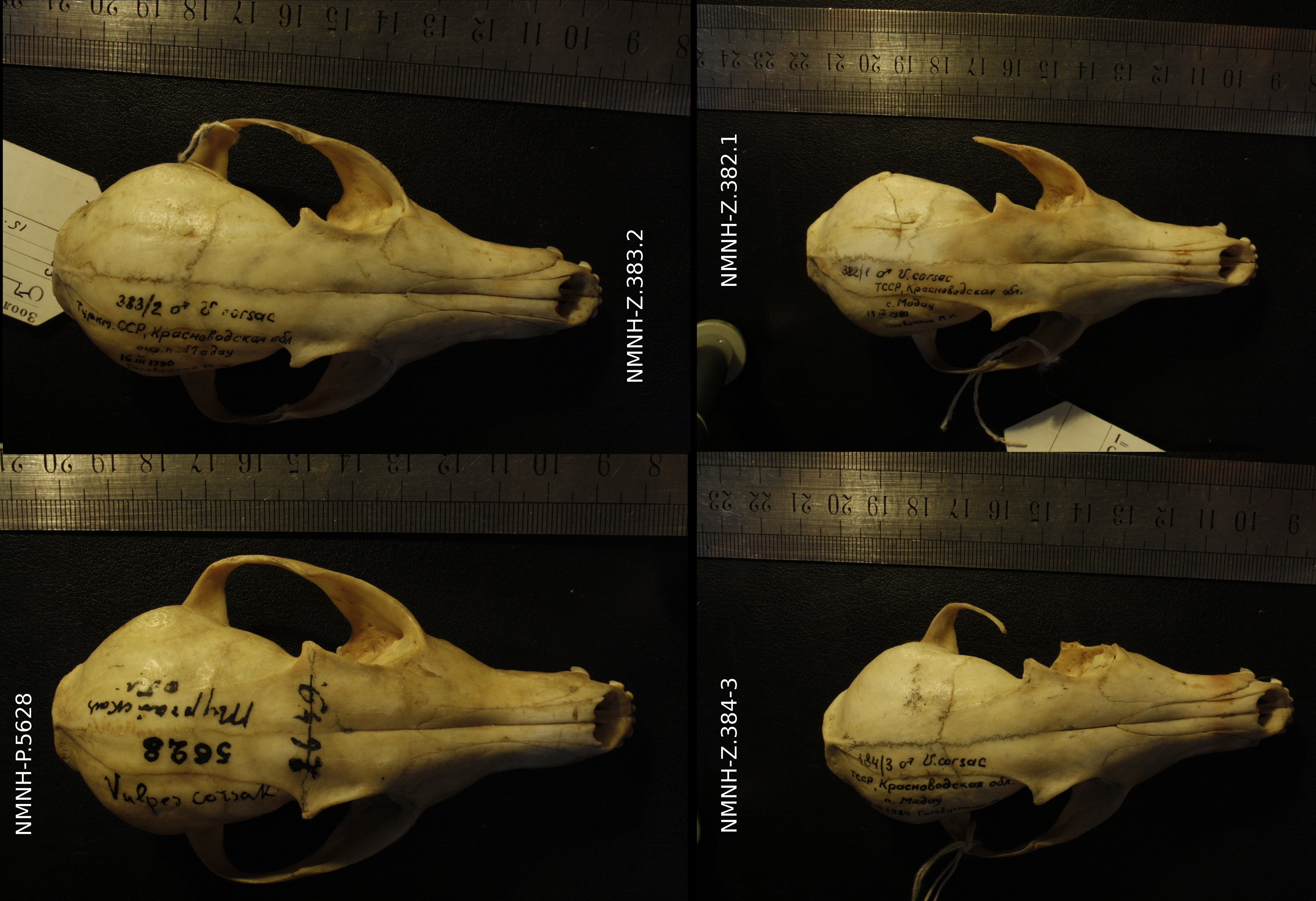 Vulpes corsac turkmenica / spp. - 3 mâles / 1 indéterminé - Collection : Musée de Zoologie / Musée de Paléontologie, Muséum National d'Histoire Naturelle, Kiev, Ukraine (Id:384.3, 383.2, 382.1, 5628) - Pays : Turkménistan (1980) / ?